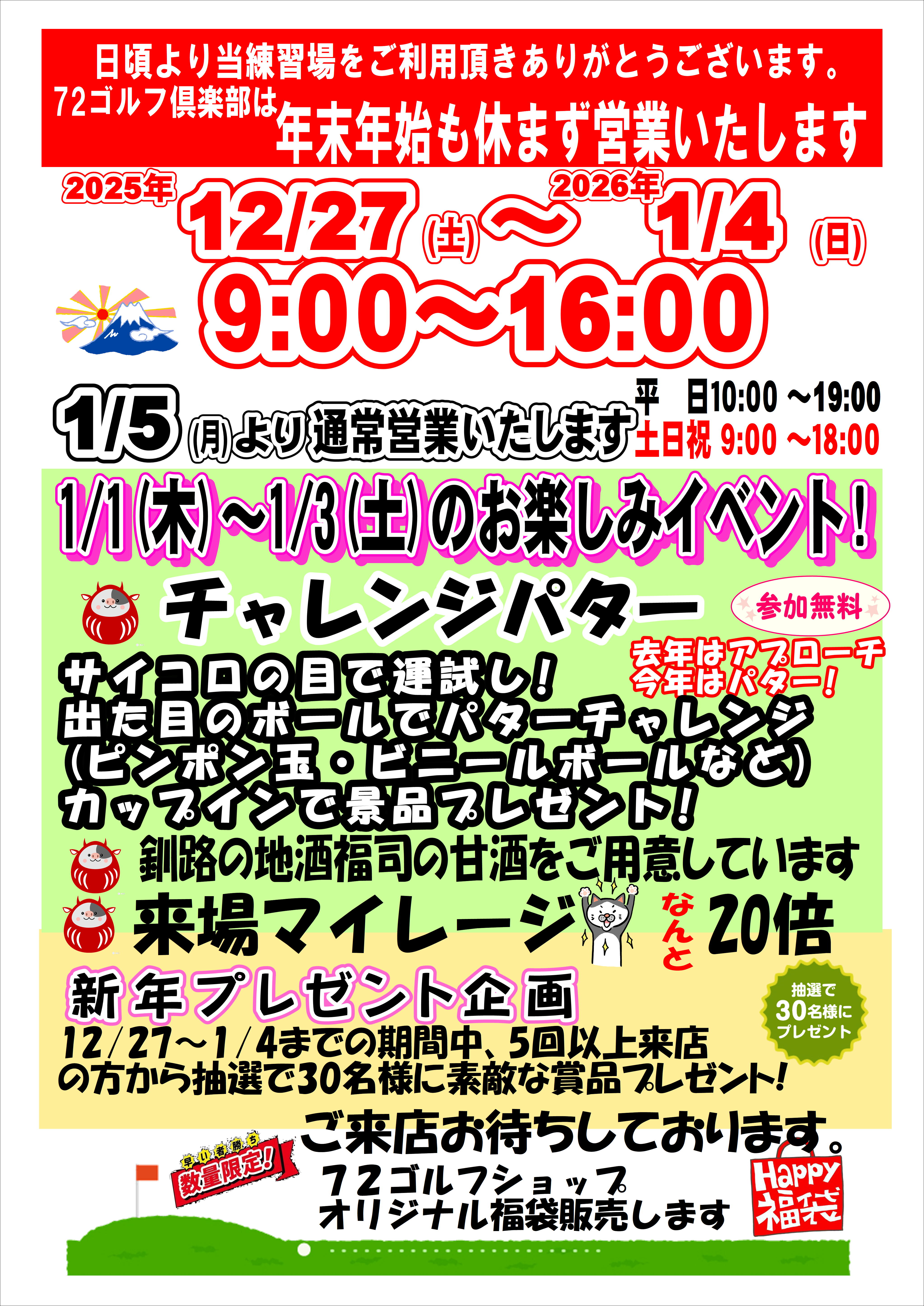 72ゴルフ倶楽部は平成元年7月北海道釧路市にオープンした、全62打席・最大240ヤードのゴルフ練習場です。アクセスの良さと充実した設備を整え、初心者から上級者まで幅広くご利用頂いております。